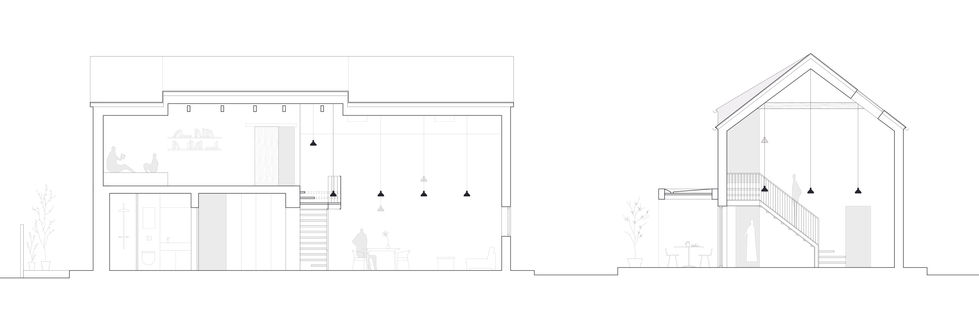 Прибудова, що по габаритам дублює стару споруду, але задумана як єдиний поверх, без перекриття, легка і швидка у зведенні, створює простору та світлу вітальню – центральний житловий простір. Цей простір перетікає по відкритим сходам на другий поверх, де облаштована мастер-спальня з великою ванною та гардеробом. В умовах енергетичної кризи через війну базове функціональне ядро може існувати автономно від нового відкритого об’єму, використовуючи пічне опалення з кухні. У мирний час прямий анфіладний зв’язок між компактними приміщеннями старої споруди та просторою, залитою світлом вітальнею створює захоплюючий контраст просторового досвіду, поєднуючи старе і нове у домі, що є і прихистком, і великою комфортною оселею.